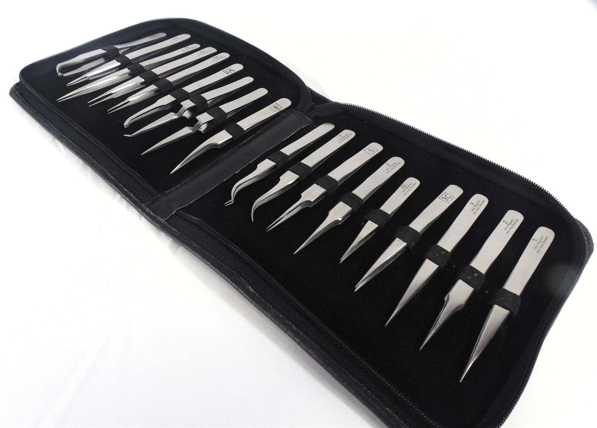 A complete set of 18 precision tweezers