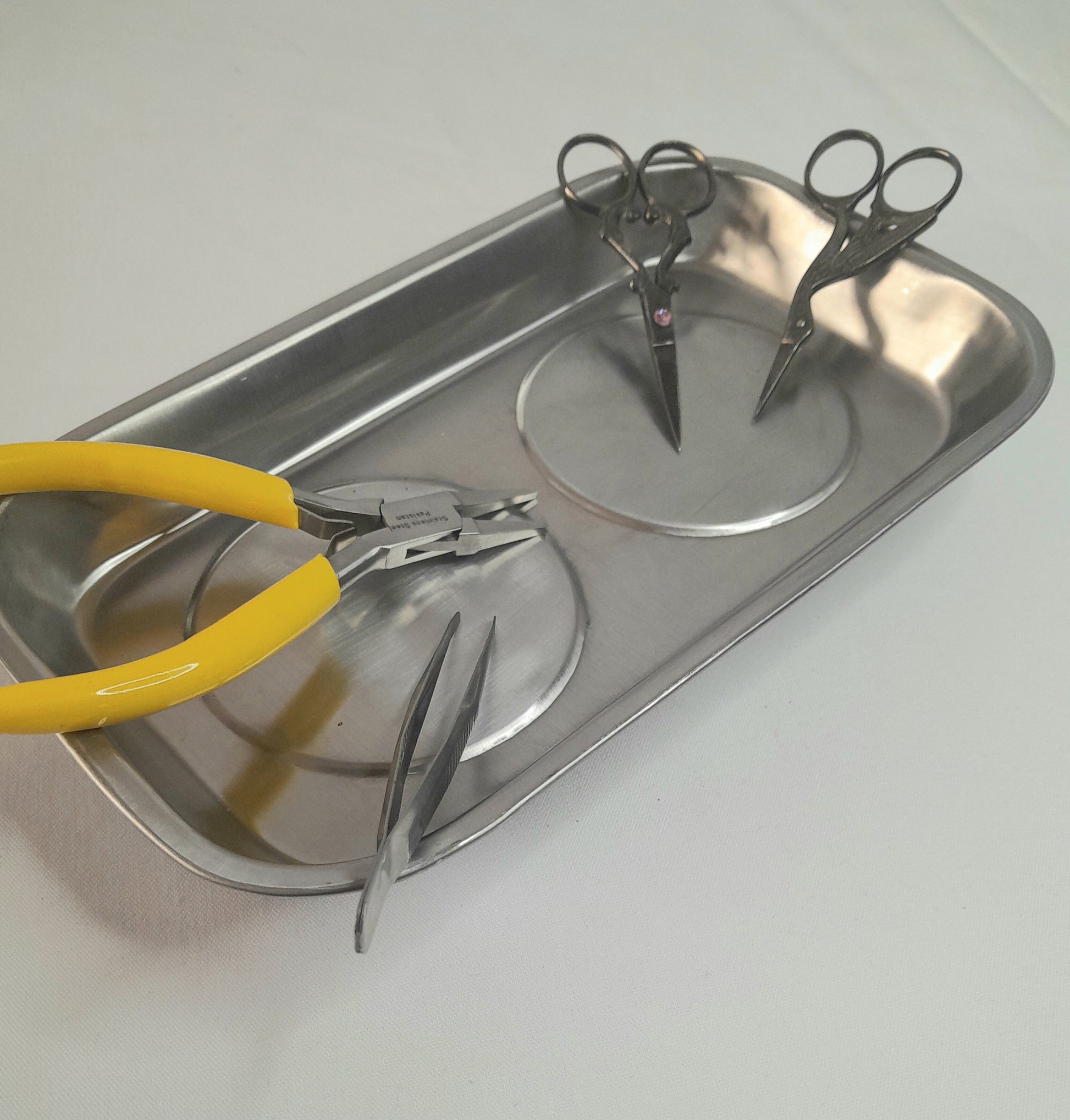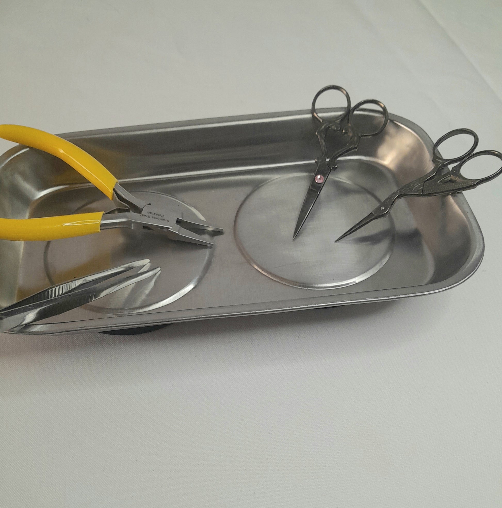 A wonderful sturdy tray to keep your tools all in one place. Regardless of your craft, everyone can use a magnetic tray. Approximately 9.25" long, 5" wide and 1" deep.