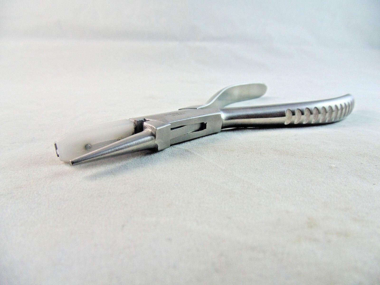 A very unique nylon tipped pliers. Stainless steel with nylon tips and wonderful for working delicate and fragile parts. Glass blowing, stained glass, crystal, delicate beads & stones, jewelry, optometry, circuitry, electronics, etc...