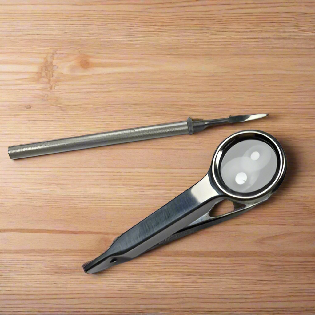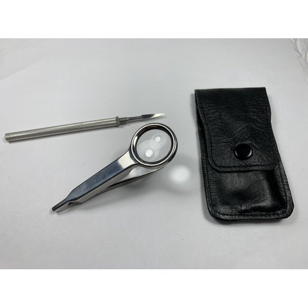 Surgical stainless steel set of 2 including magnify tweezers, probe and leather case