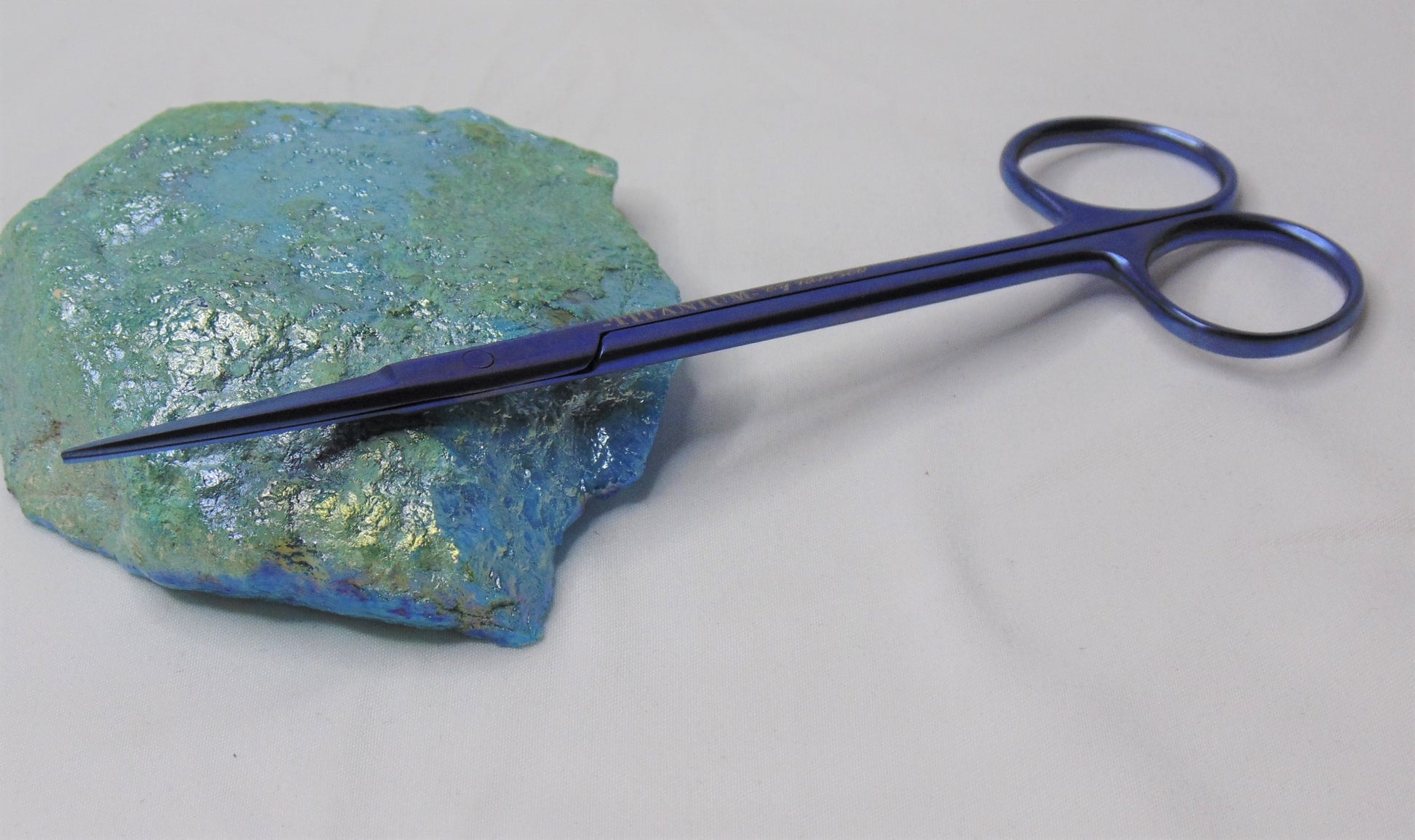 Titanium (6-4) precision scissor 6" with blue anodized finish. Titanium is free of iron so does not rust or corrode even in the salt water environment. OUR TITANIUM LINE IS 6% ALUMINUM AND 4% VANADIUM. TITANIUM IS IMMUNE TO CORROSION, IS NON-MAGNETIC AND HAS AN EXCELLENT WEIGHT TO STRENGTH RATIO. Its WEIGHT IS NEARLY 50% LESS THAN THAT OF 400 SERIES STAINLESS STEEL. MOST OF OUR INSTRUMENTS CAN BE PRODUCED IN TITANIUM AND CAN BE FINISHED IN SATIN OR NON-REFLECTIVE BLUE.